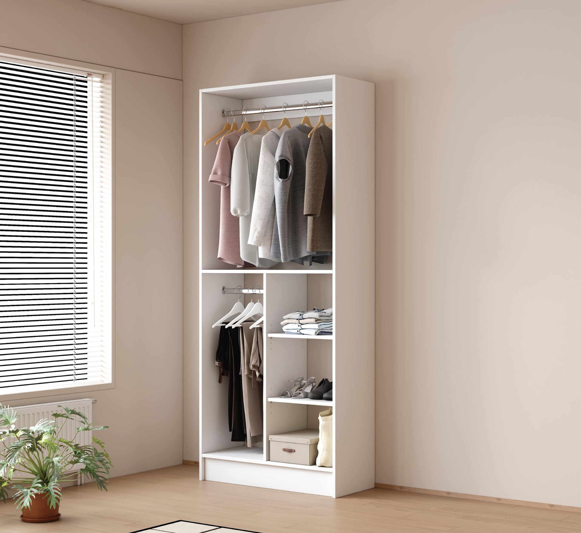 Optimiza tu espacio con este módulo doble tubo con tablillas, diseñado para una distribución eficiente de tu ropa. Ideal para camisas, pantalones y zapatos, su estructura en particle board hidrófugo lo hace resistente a la humedad y a la polilla, garantizando durabilidad y calidad.